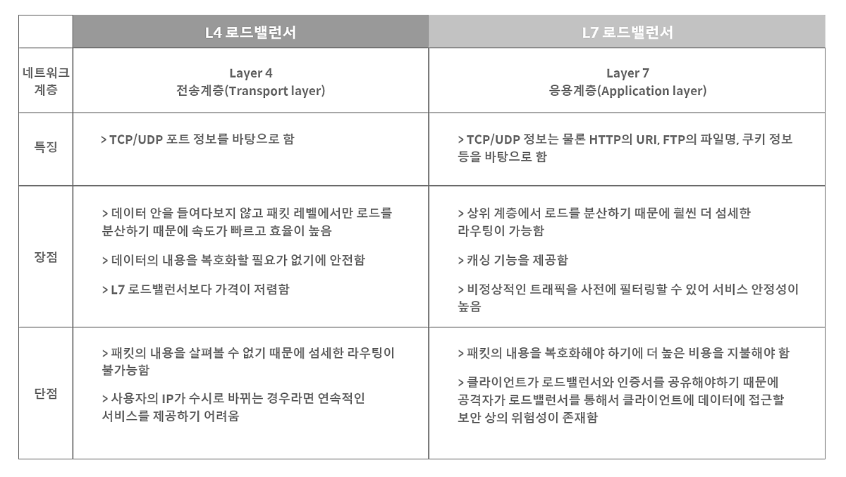 로드밸런싱을 진행은 보통 L4스위치 로드밸런싱과 L7스위치 로드밸런싱를 통해서 이루어지는데 비교해보면 아래표와 같다.