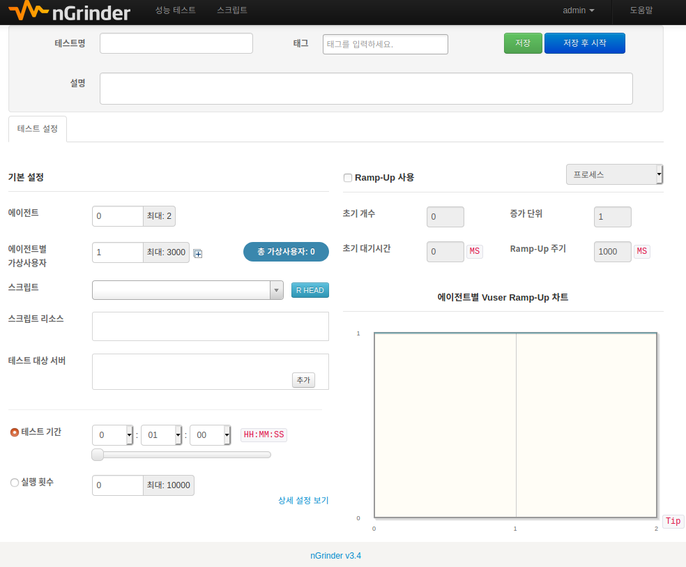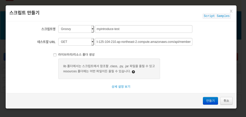 스크립트 명을 정해주시고 테스트할 url과 해당 url이 post인지 get인지 선택해주세요.