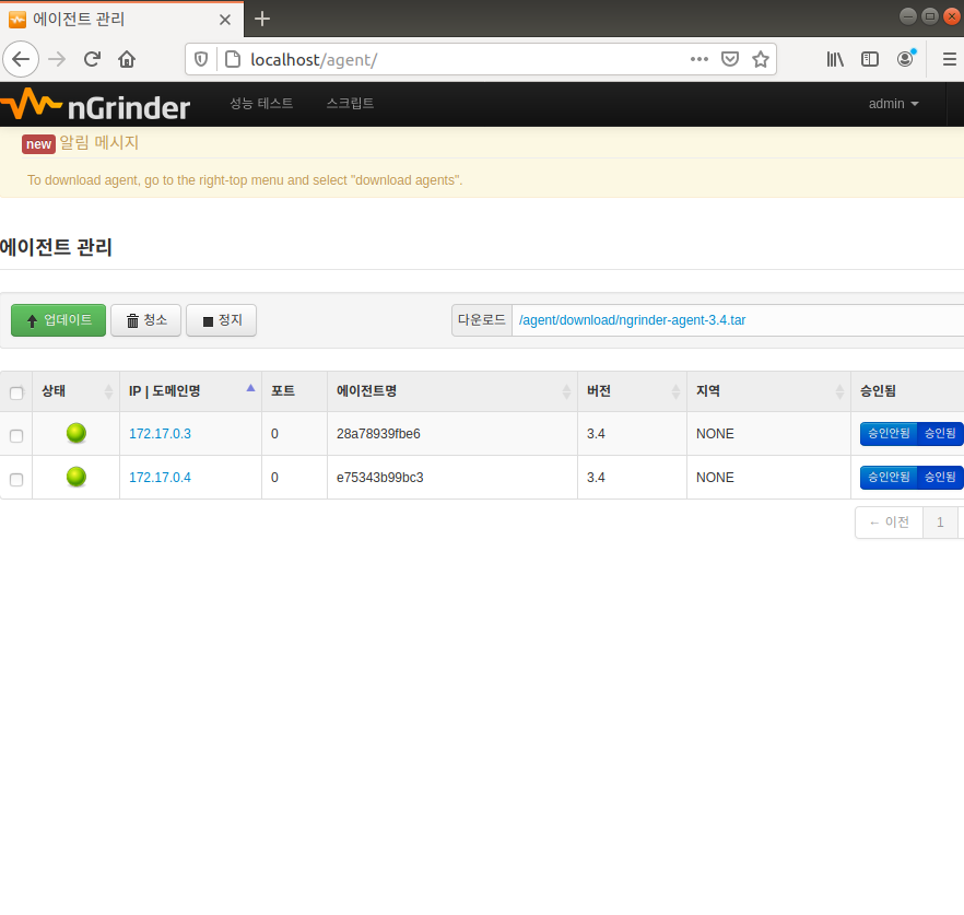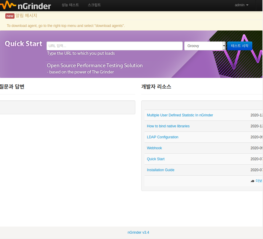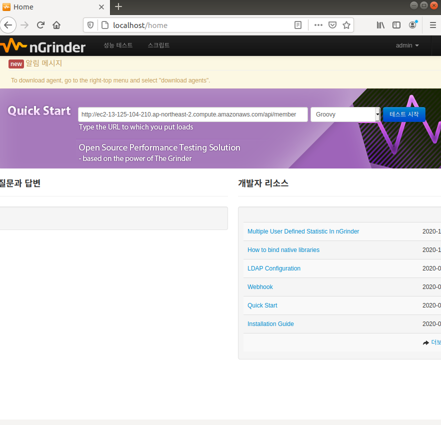 docker를 통한 ngrinder 설치 및 사용 01 Jul 2019 | ngrinder Docker 엔그라인더 부하테스트 nGrinder 란? 네이버에서 성능 측정 목적으로 개발된 오픈소스 프로젝트이며, The Grinder라는 오픈소스 기반으로 개발