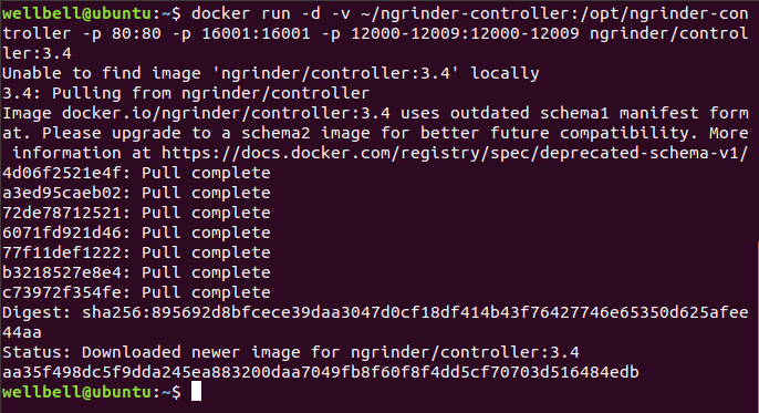 docker run -d -v ~/ngrinder-controller:/opt/ngrinder-controller -p 80:80 -p 16001:16001 -p 12000-12009:12000-12009 ngrinder/controller:3.4