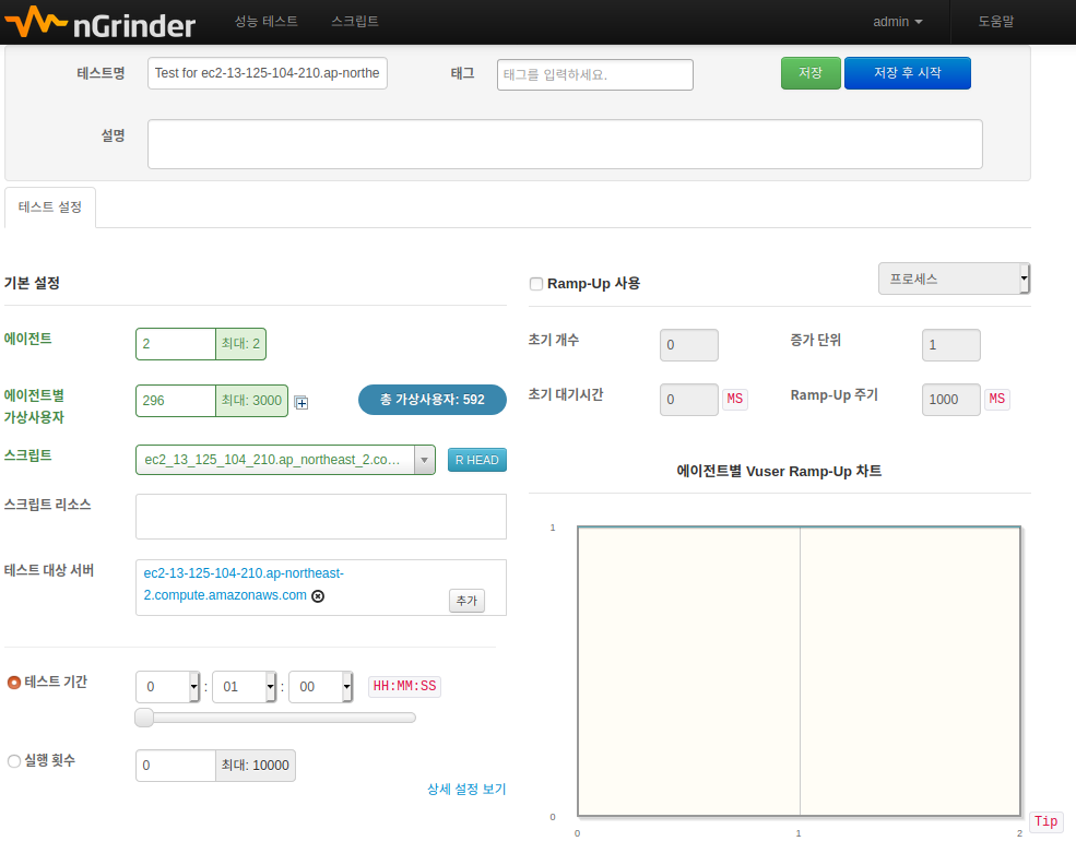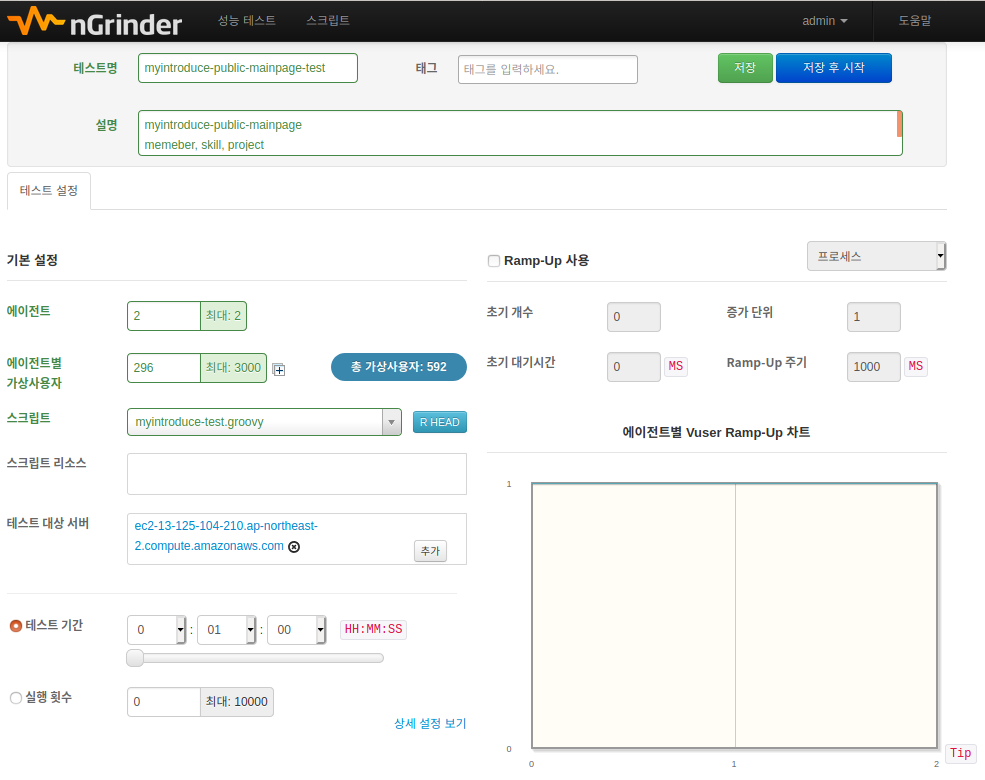시작 버튼 클릭시 이러한 화면으로 이동하는데 저는 에이전트 2개를 모두 사용하고 가상사용자를 각 약 300명 총 600명 수준의 접속에 대한 부하 테스트를 1분간 진행 해보겠습니다. 본인들이 테스트하고 싶은 수준을 설정한 뒤 상단에 저장 후 시작을 누르시면 테스트가 실행됩니다.