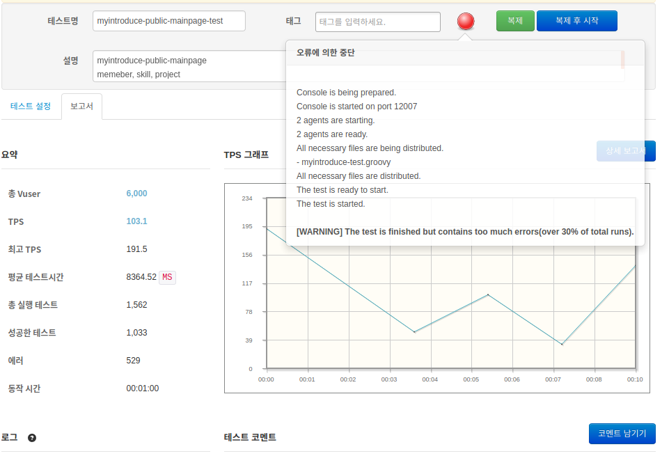 6000명 수준이 되니 오류가 30%가 넘어가면서 테스트가 중단되는 모습