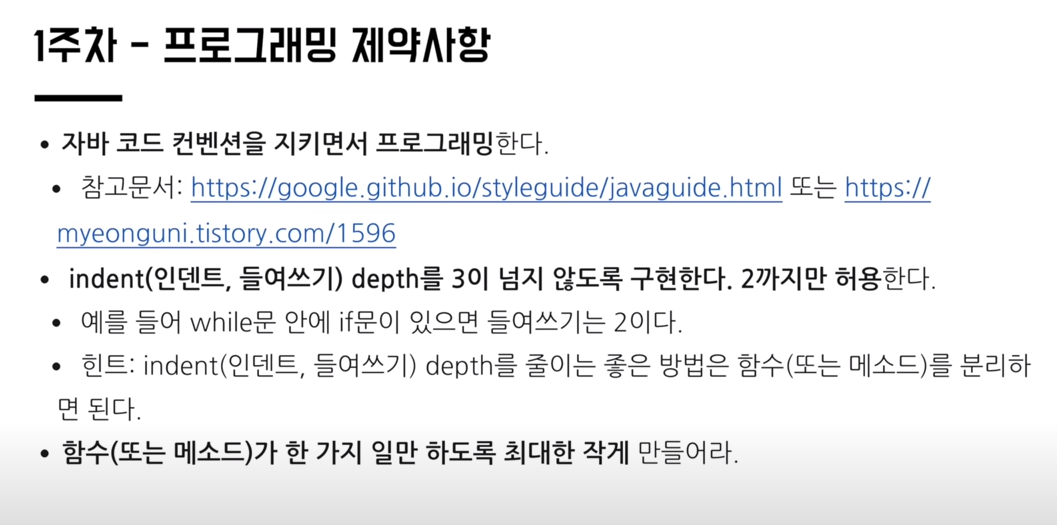 위 사진은 우아한 테크코스에서 교육생들에게 내주는 과제의 조건이다. 사실 1주차 내용이기에 간단하지만 주차가 진행되면서 더 어려운 조건을 부여 받아서 진행하는 것 같다.