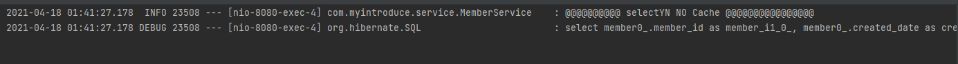 설정후 서버를 실행시킨 뒤 해당 service를 타는 요청을 보내게 되면 한번반 log가 나오고 그뒤로는 나오지않습니다. 해당 서비스를 타지않고 redis로부터 캐쉬를 받아서 리턴한다는 것을 알 수 있습니다.
