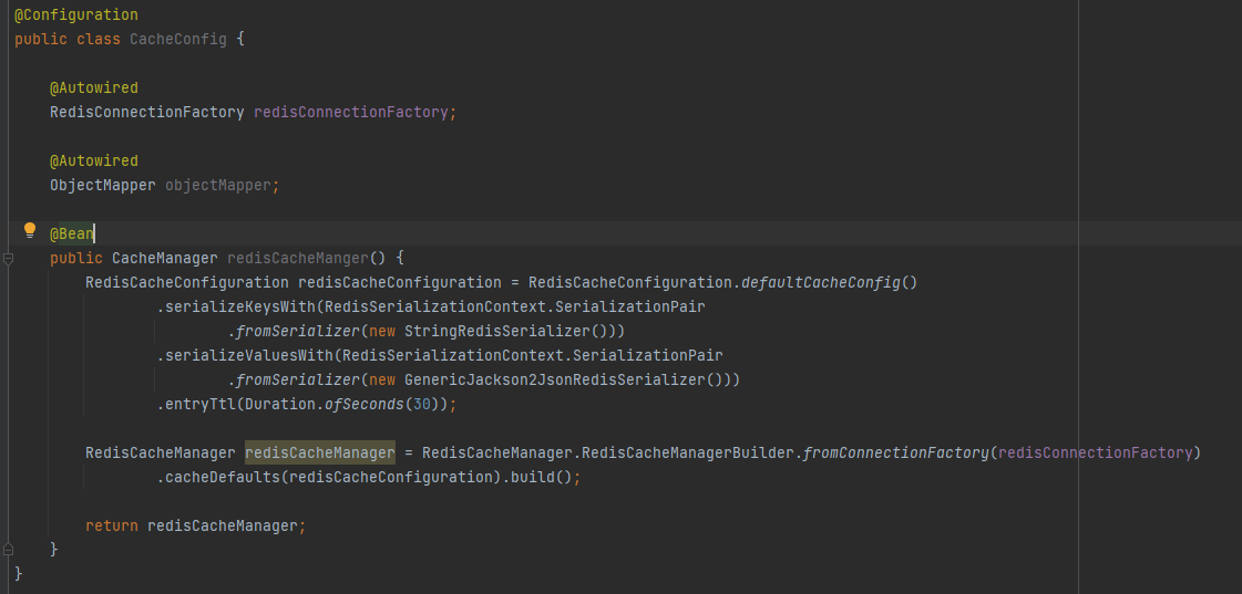 Spring CacheManager타입의 CacheManager를 빈으로 등록해주면 Spring에서는 캐싱을 할 때 로컬 캐시에 저장하지 않고 redis에 저장하게 됩니다. 위와 같이 redisCacheManager를 등록