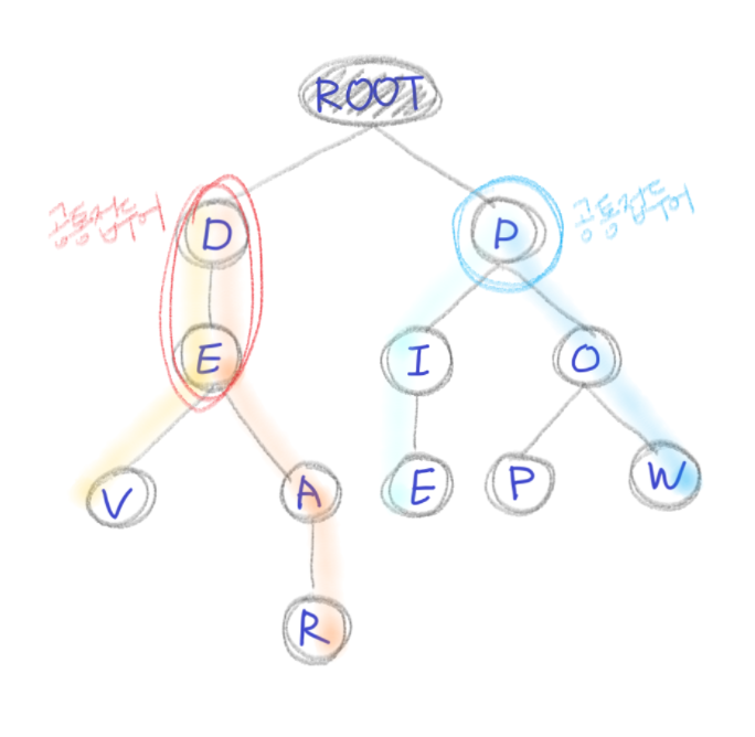 다음은 DEV, DEAR, PIE, POP, POW라는 단어가 들어있는 Trie 자료구조를 도식화한 것이다. 휴대폰 전화번호부에서 검색을 하거나 사전에서 단어를 찾는 것과 같다.