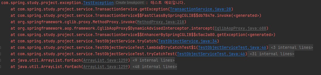 윗부분은 printStackTrace로 TestException에 대한 내용을 담고 있습니다.