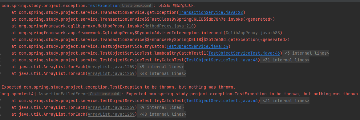 아래는 테스트 코드 부분으로 내용은 TestException이 던져질거라고 기대했는데 아무것도 던져지지 않았다라는 의미입니다.
