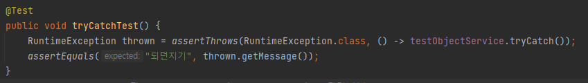 assertEquals("테스트 예외입니다.", thrown.getMessage());