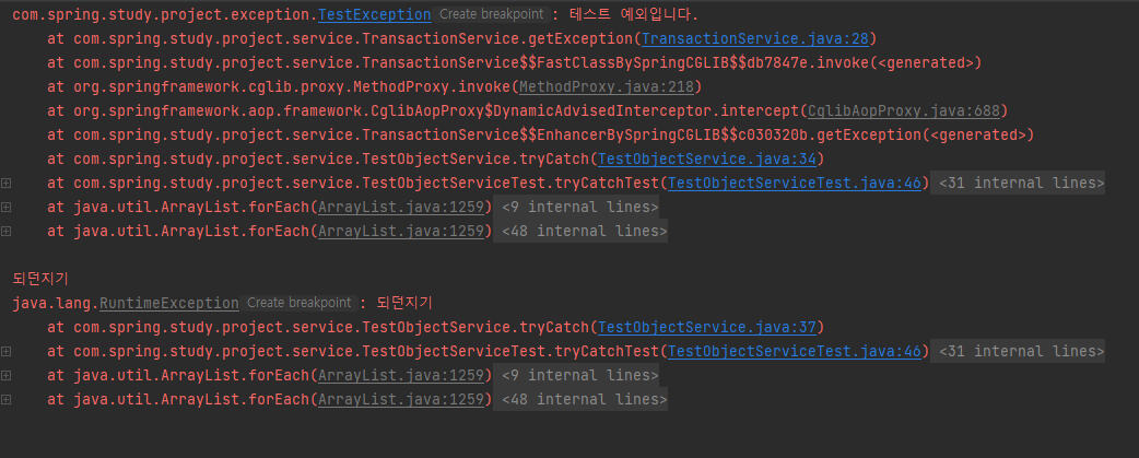 테스트를 돌려보면 아래와 같이 나오는데 위부분은 e.printStackTrace 부분이고