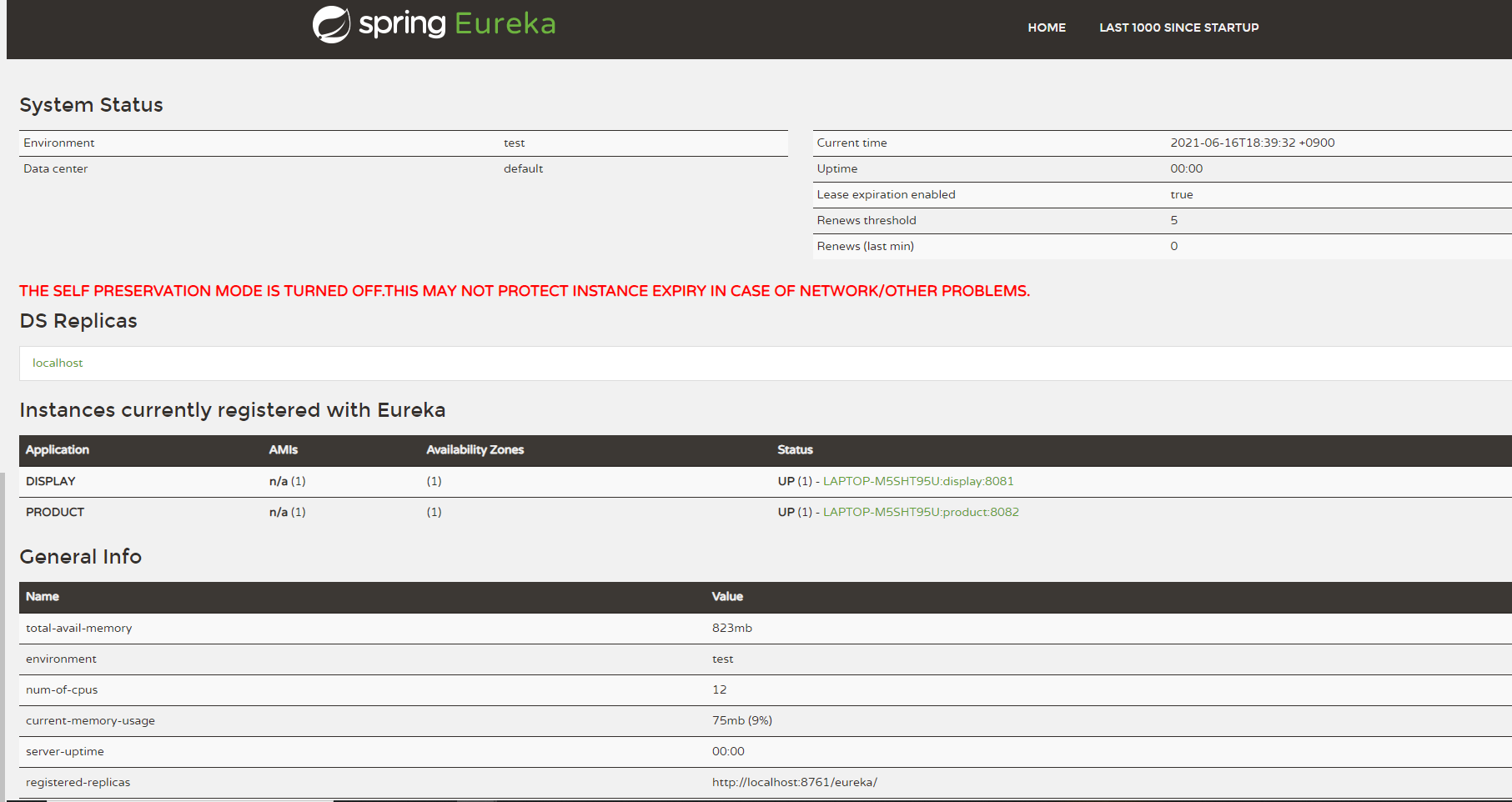 - 일시적인 네트워크 장애로 인한 서비스 해제 막기 위한 자기 보호 모드 (디폴트 true, 운영에선 반드시 true 로 설정 필요)
