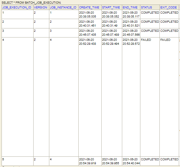 JOB_EXECUTION은 자신의 부모 JOB_INSTACNE가 성공/실패했던 모든 내역을 갖고 있습니다.
