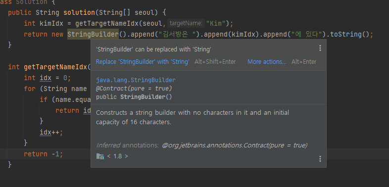 3 경우를 보면 StringBuilder가 시간적인 측면에서 압도적인대 IDE에서는 StringBuilder를 String으로 변경가능하다고 표시해줍니다. 그럼 이는 String은 불변 인대 반해 StringBuffer, StringBuilder 는 가변 객체라는 문제가 있습니다. 심지어 StringBuilder 는 동기화 되어 있지않아서 멀티 쓰레드 환경에서 쓰레드 세이프 하지않기도 하죠.