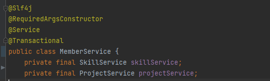 - 스프링 부트 프로젝트 개발을 진행해 보았다면 아래와 같은 형태를 많이 사용했을탠대 위와 같은 코드가 위임으로 Skill에 대한 처리는 SkillService에 위임하여 처리한다고 보면 된다.
