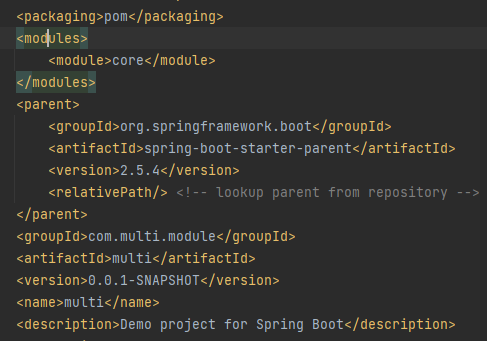 parent: 스프링부트 프로젝트로 스프링 프레임워크 부트를 부모로 셋팅해둡니다. multi를 부모로 두는 core의 경우도 스프링 프레임워크 부트 관련하여 사용할 수 있습니다. (스프링 프레임워크 부트 - multi - core 순)