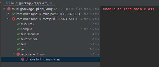 실행해보면 아래처럼 되는데 이유는 core에는 스프링부트 메인 클래스가 없어서 인데 core는 혼자서 돌아가는 모듈이 아닌데 메인 클래스를 추가해야할까?