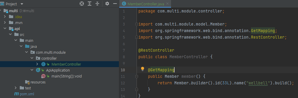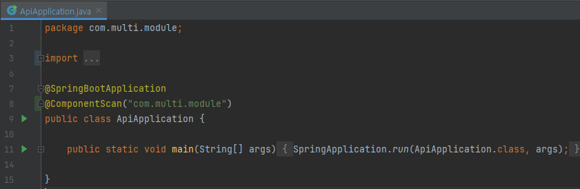 이제 src는 필요없으니 지우고 api 모듈에 ApiApplication 클래스(스프링 부트 메인)을 추가해준다.