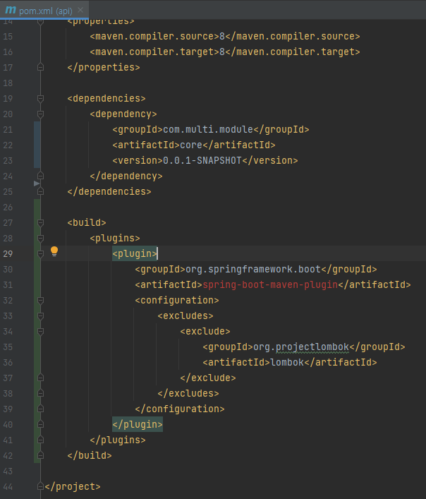 답은 아니다. 아래는 multi의 pom으로 빌드 설정이 기본적으로 들어가 있는 것을 확인 할 수 있는데 이 설정은 하위 모듈 전체에 들어가게되고 해당 빌드를 따라서 core를 빌드하려고 하기 때문에 문제가 발생한다.