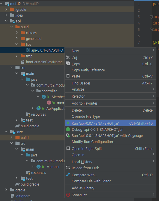 추가해주면 아래와 같이 api 모듈에서 core의 객체를 사용할 수 있게 됩니다.