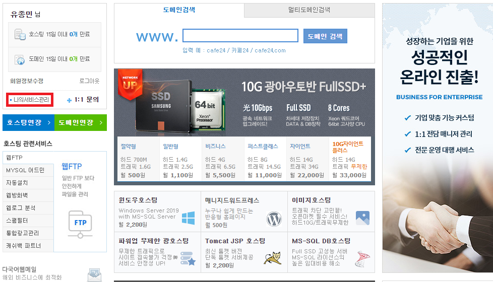 본인은 카페24를 통해서 도메인을 구입하였습니다.