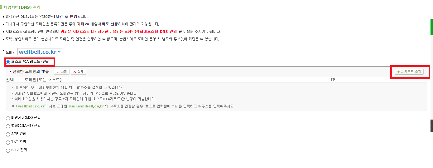 5. 호스트IP 관리 선택후 레코드 추가 버튼 클릭