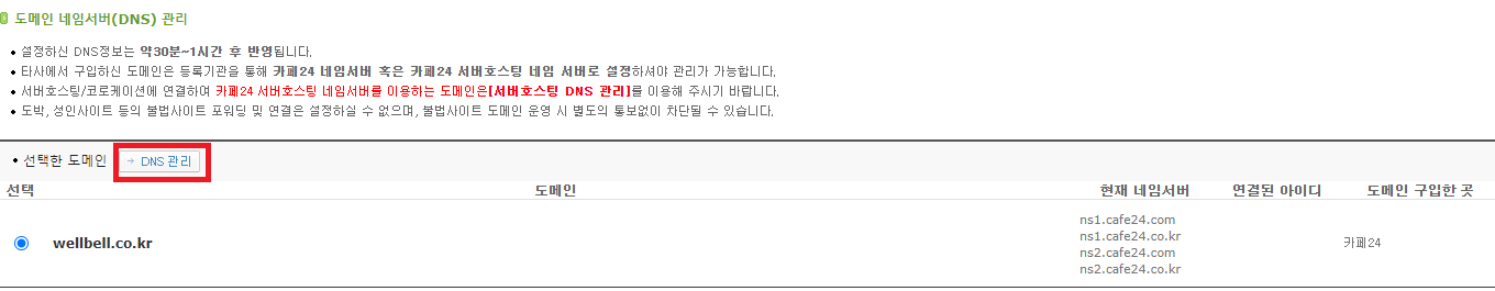 도메인을 선택후 DNS관리 버튼을 클릭합니다.