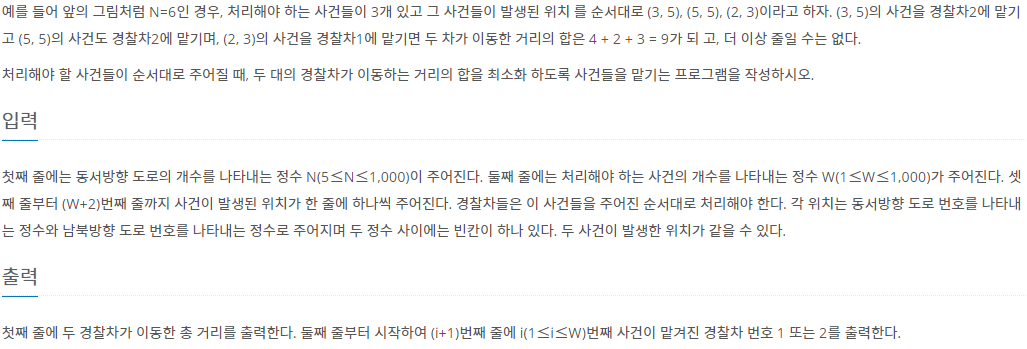 www.acmicpc.net/problem/2618 2618번: 경찰차 첫째 줄에는 동서방향 도로의 개수를 나타내는 정수 N(5≤N≤1,000)이 주어진다. 둘째 줄에는 처리해야 하는 사건의 개수를 나타내는 정수 W(1≤W≤1,000)가 주어