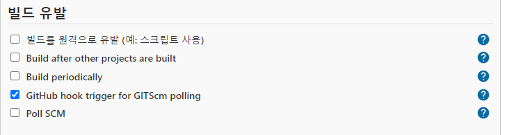 - 구성에서 빌드유발이라는 영역에서 GitHub hook trigger for GITScm polling 을 선택해줍시다.