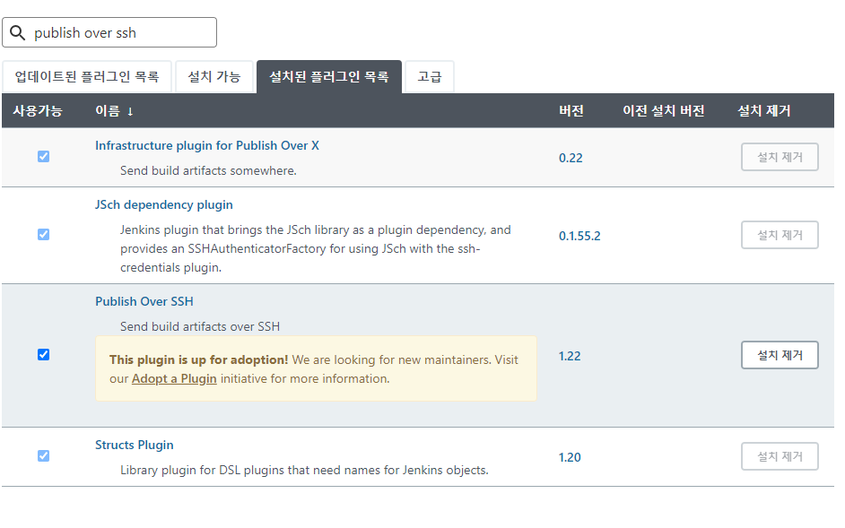 - 필자의 경우 이미 설치한뒤에서 실치된 플러그인 목록에 뜨는데 설치 이전이면 설치 가능 탭을 클릭하고 검색해야합니다.