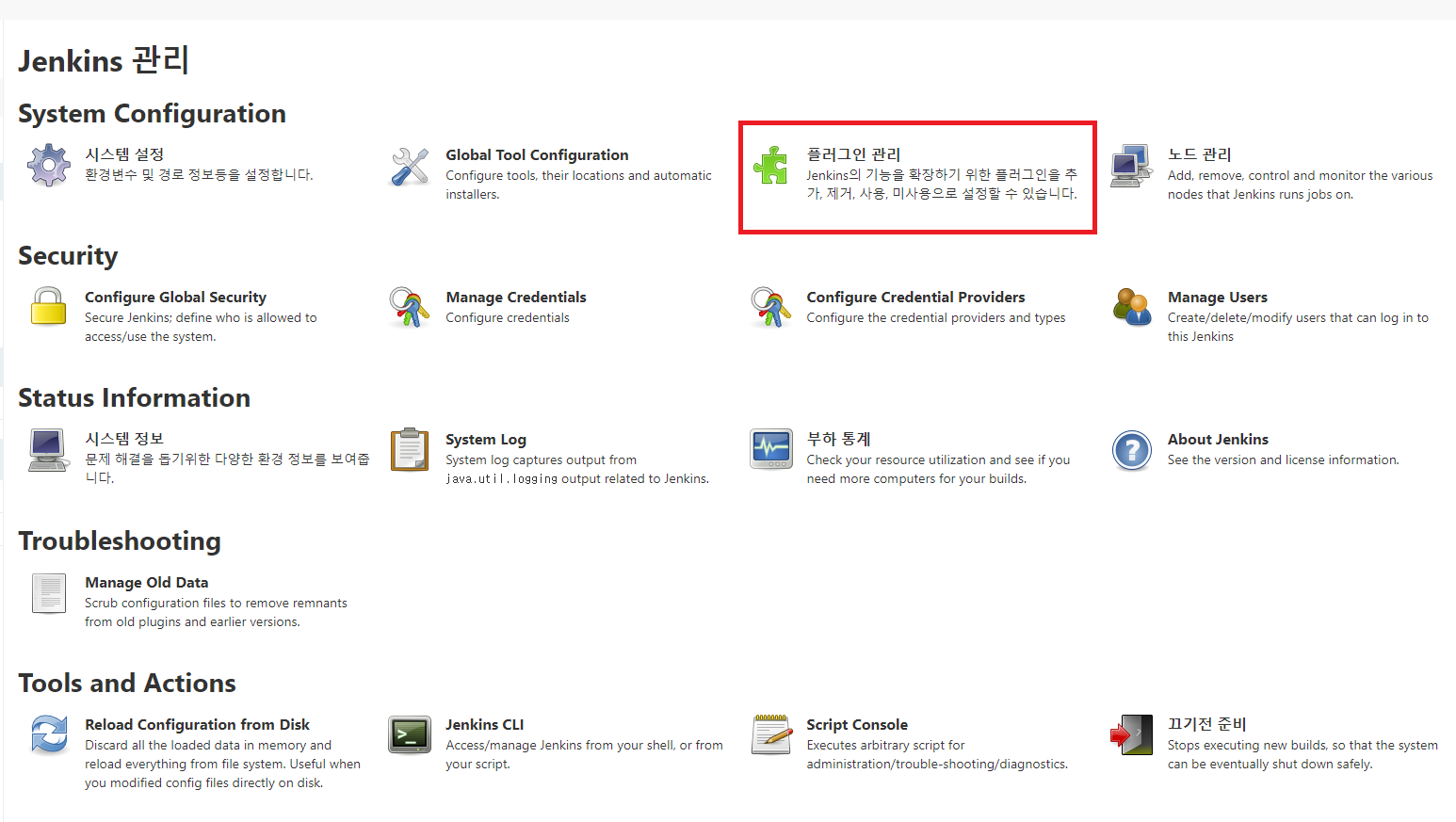 - 젠킨스 관리 메뉴들 중 플러그인 관리로 들어갑니다.