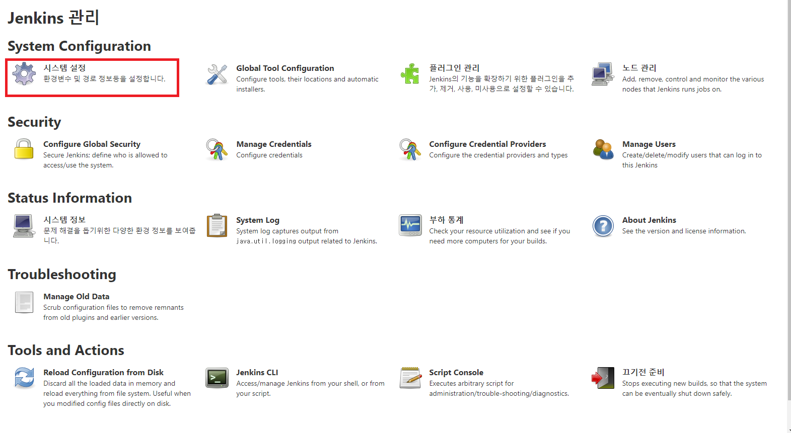 - 이번엔 젠킨스 관리의 시스템 설정으로 들어갑니다.